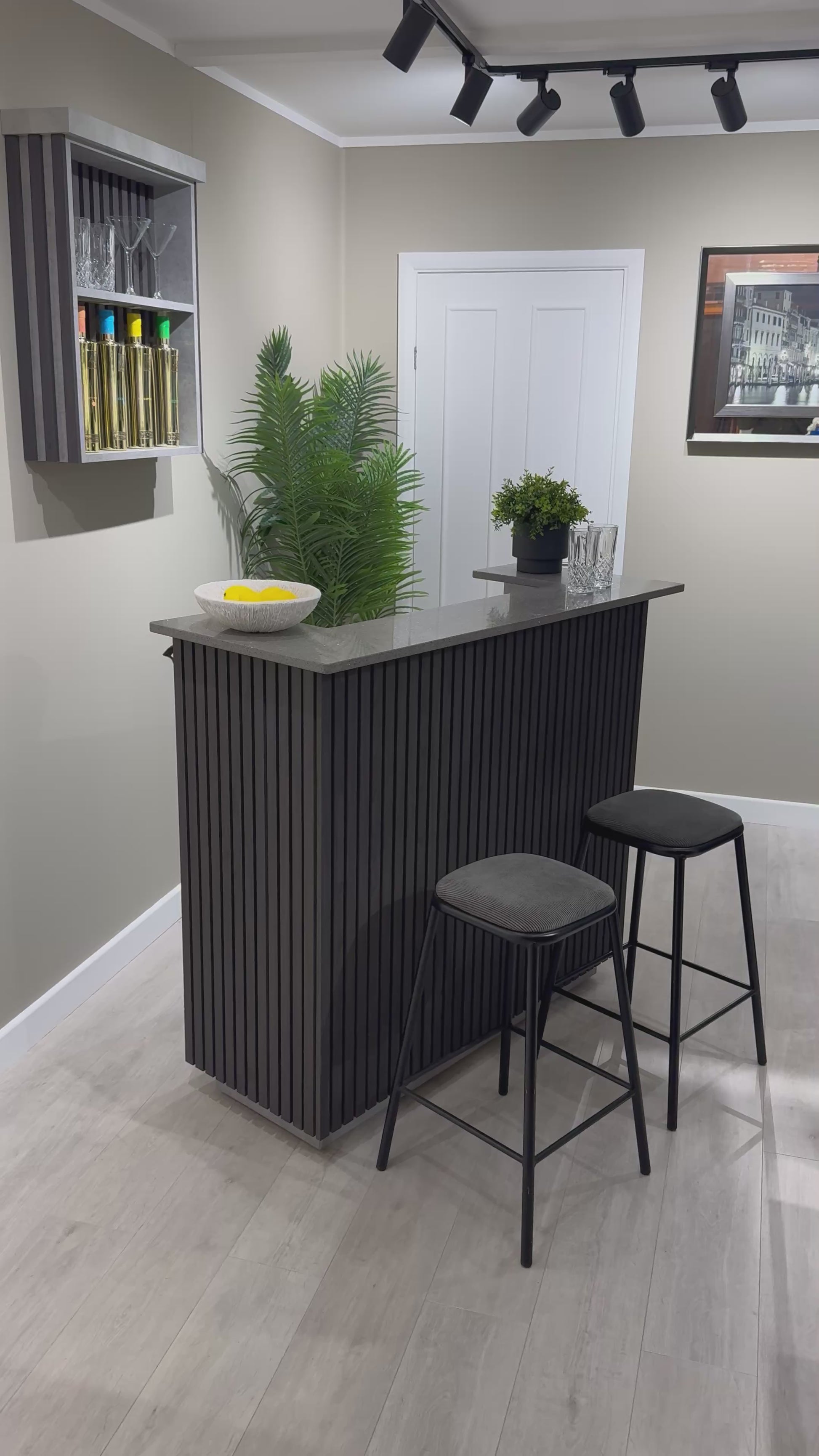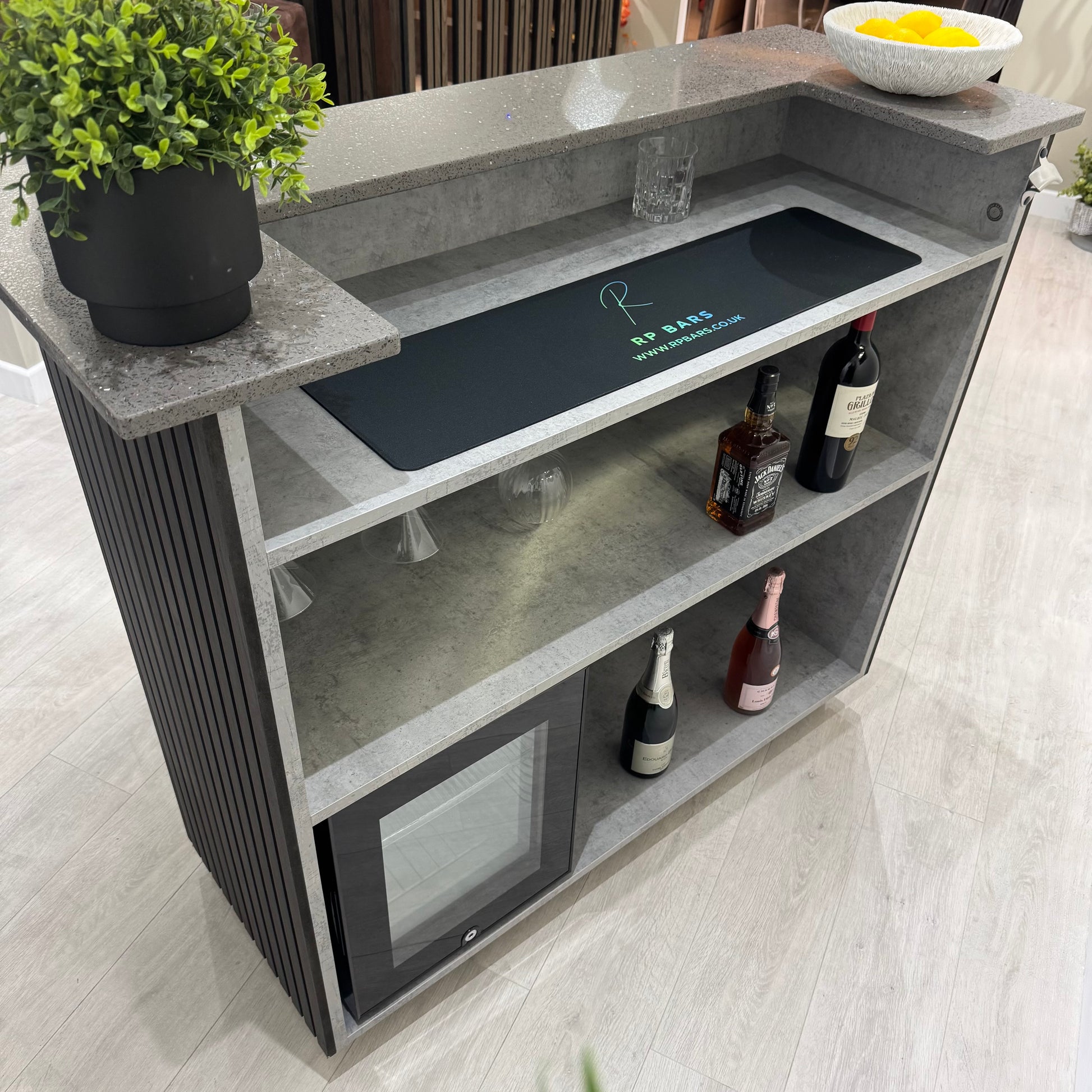Studio Black & Grey Slat Home Bar with Grey Sparkle Quartz Worktop